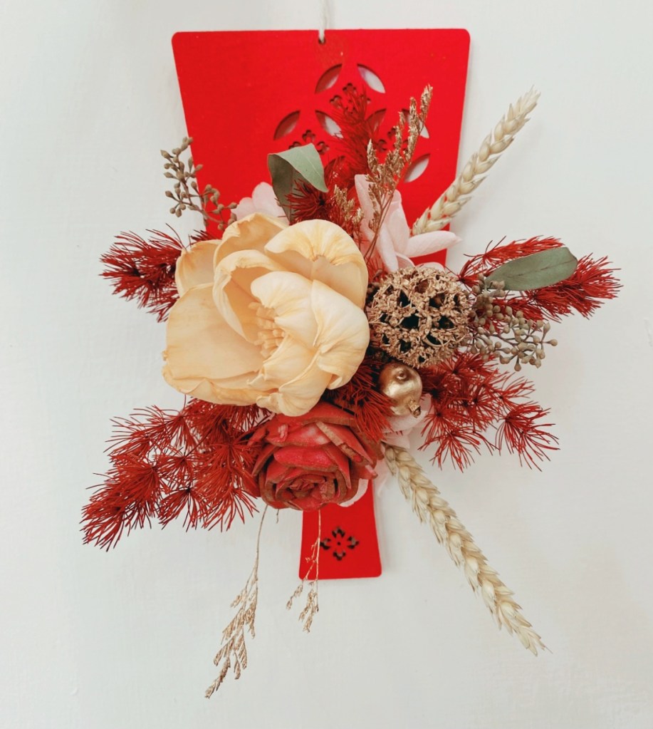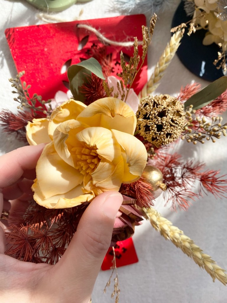 今年宅主Ivy和晴冬花藝闆娘冠瑩,特別挑選日本進口的年節限定木雕花板,要讓大家來嘗試點不一樣的!參與課程的夥伴除了可以在老師引導下自行挑選花材及配色,製作有別於傳統稻草結繩、且擁有自己風格品味的作品,特選進口永生、人造及乾燥花材就算過了年節,搭配精緻木雕花板掛飾也可以持續在家中擺放,替自己帶來一整年的繽紛好運和滿滿手作儀式感。
