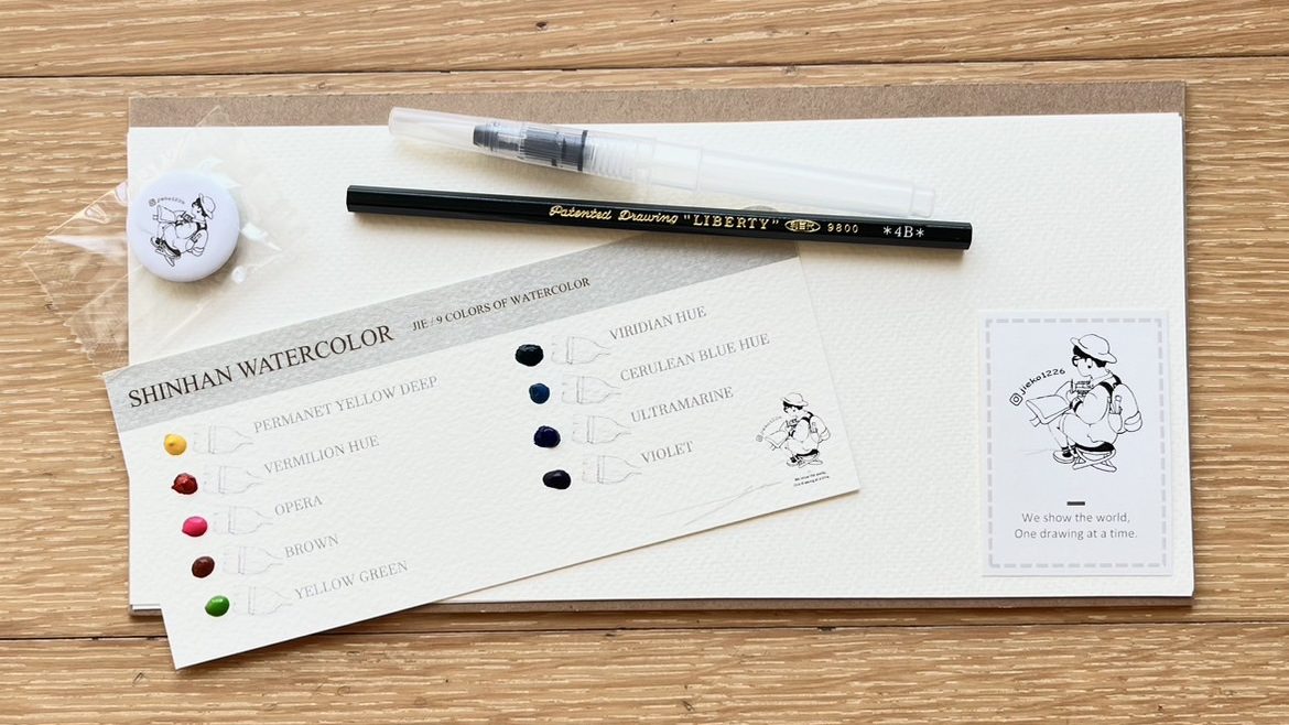 ***「課程限定。旅繪體驗珍藏組」內含該堂課程繪製主題分解圖、水彩紙*2張、牛皮紙畫板、鉛筆、水筆、JIE特製顏料色卡及JIE胸章。