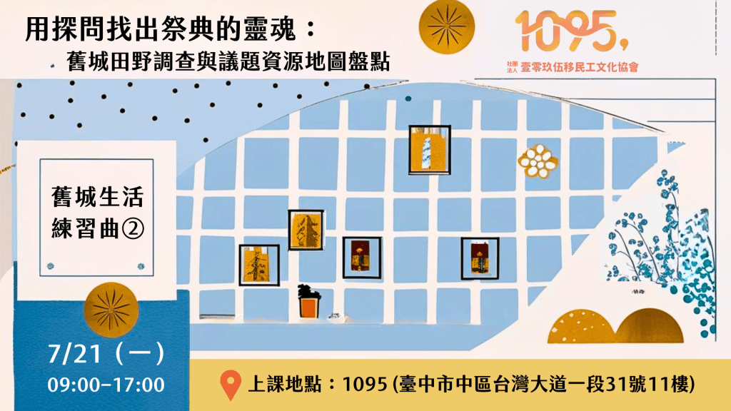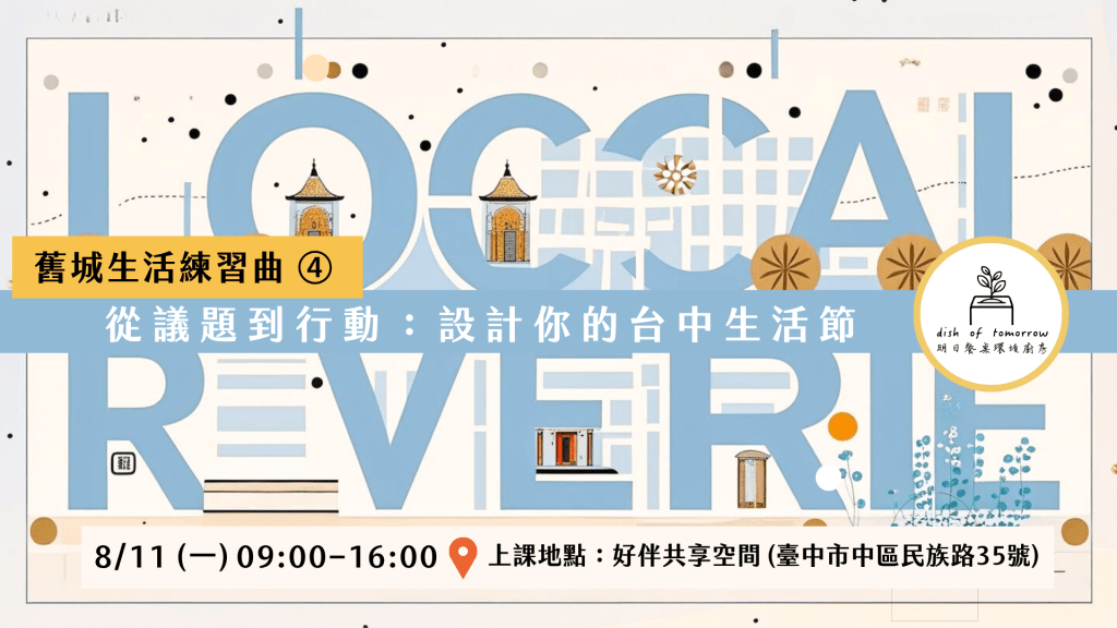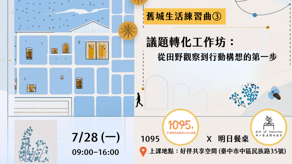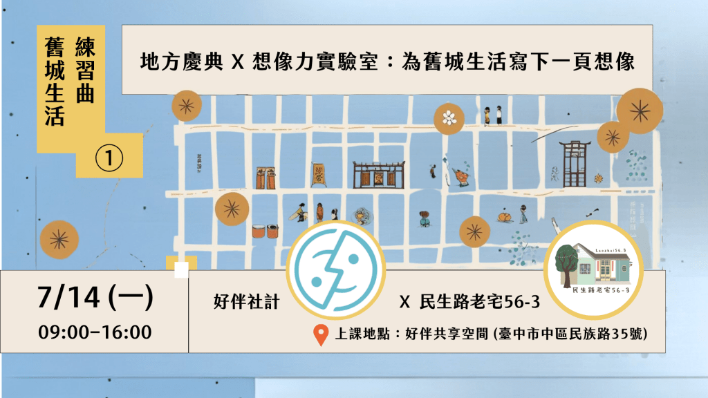 所以今年,位在臺中舊城區的四個青聚點團隊:好伴社計、民生路老宅56-3、明日餐桌、1095,決定勇敢嘗試、打破這個框架與迷思,邀請大家一起走進臺中舊城,透過4個團隊攜手規劃的6堂一日工作坊,一同寫下「對臺中舊城地方慶典與在地生活的想像」,並將其轉化成一場實際發生的地方行動/活動!