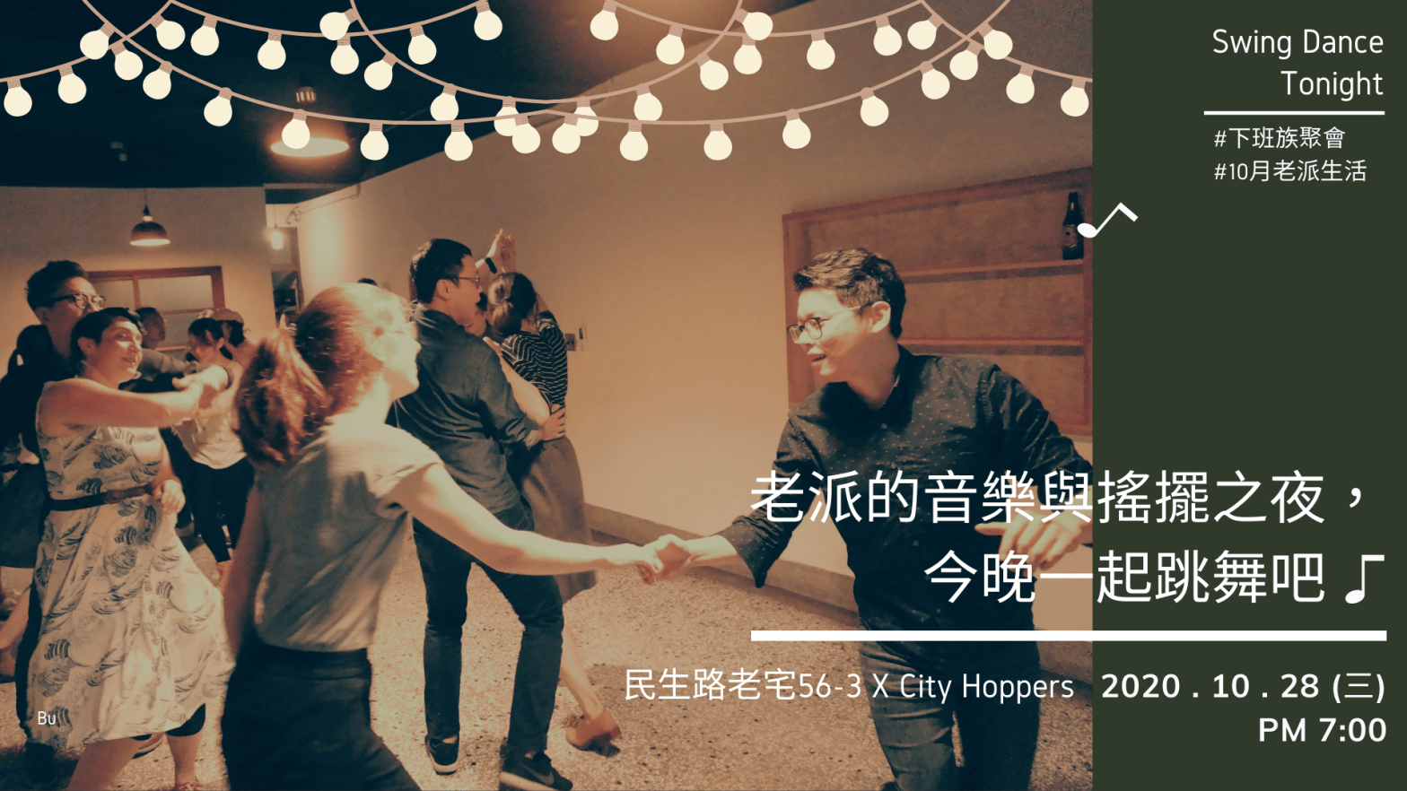 10月份 #下班族聚會 老派生活的最後一週,讓我們用「搖擺舞」一起將老宅大廳變成復古社交聯誼舞廳吧!這一晚,就從Jazz爵士音樂開場,先和大家聊聊音樂、聊聊文化,最後再身體力行跟著City Hoppers的夥伴們,一起感受Swing Dance的魅力!