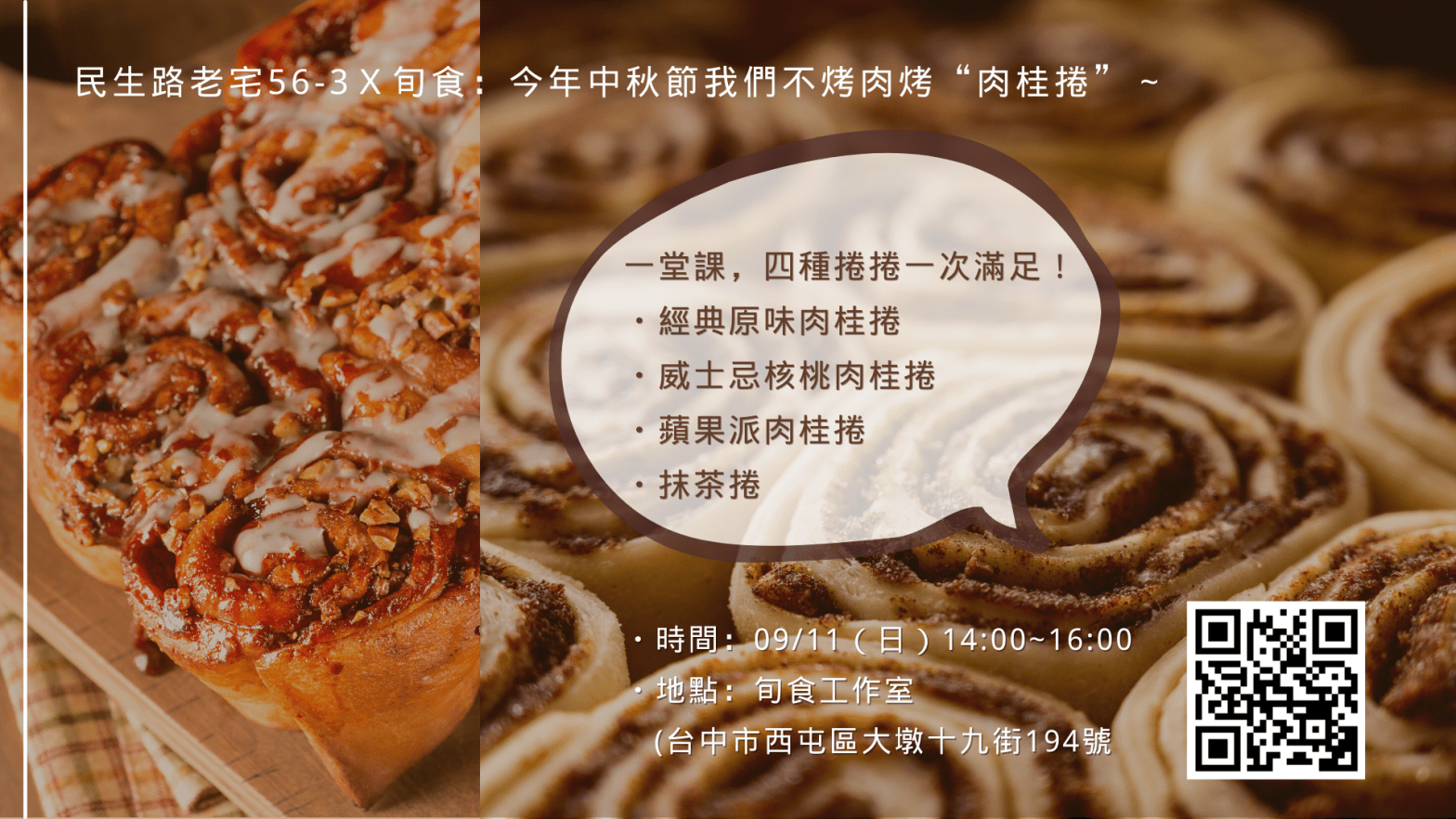 中秋節吃膩各種口味烤肉了嗎?今年中秋節我們不約大家烤肉,改到旬食和洋菓子工作室和老師們一起來場四種口味肉桂捲一次滿足的午後DIY小約會~
